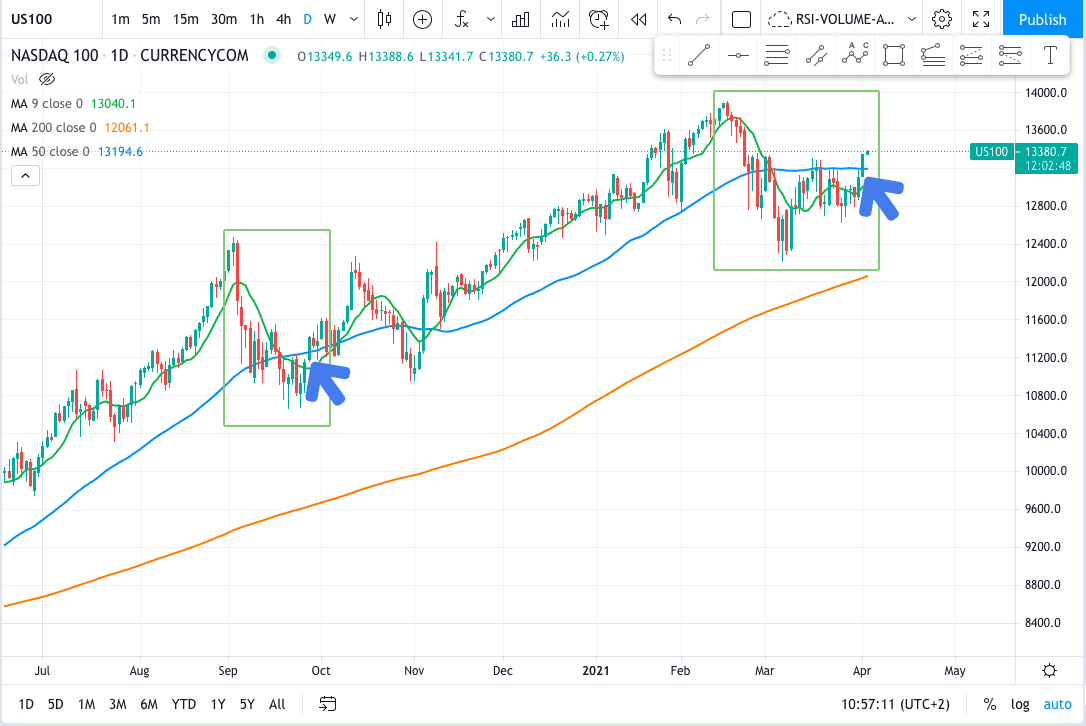 Az első zöld téglalap a szeptemberben elkezdődött korrekciót jelöli. A vezető technológiai index akkori mindenkori csúcsáról két hét leforgása alatt beesett az 50 napos mozgóátlag alá (kék vonal).